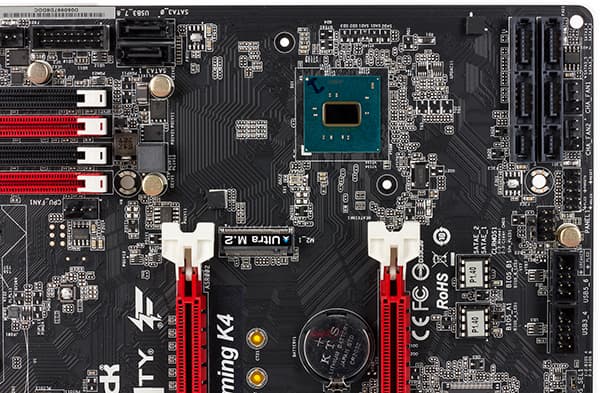 Разъем M.2 поддерживает устройства PCIe 3.0 x4 и SATA 6 Гбит/с, а для его реализации используется четыре чипсетных порта PCIe 3.0 и один порт SATA 6 Гбит/с, что обеспечивает пропускную способность в 32 ГТ/с (при подключении PCIe 3.0 x4 устройств).