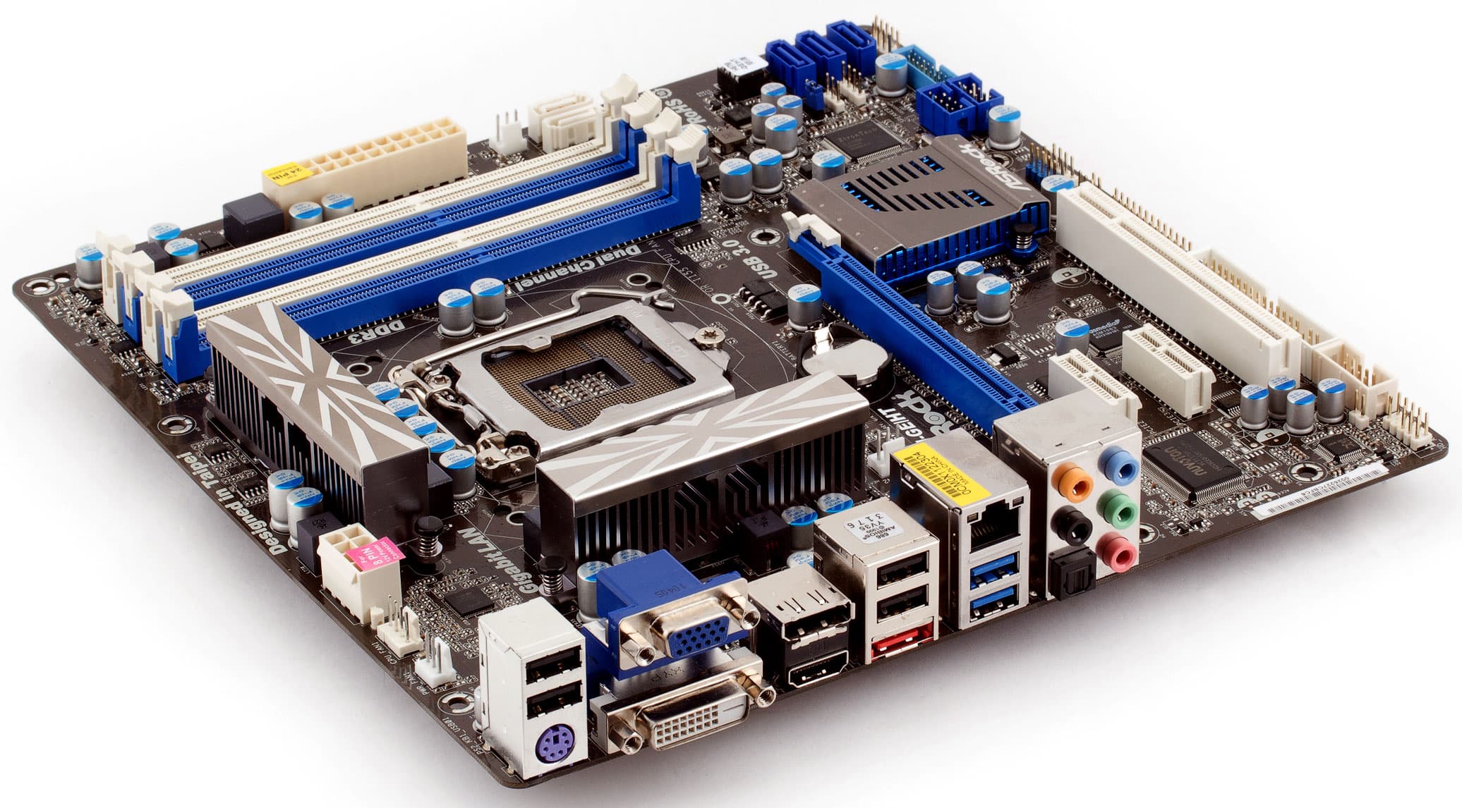 Формат microATX не предполагает излишеств — ну так мы их и не наблюдаем: один слот PCI-E x16, 2 слота PCI-E x1, один PCI. Правда, отдельное спасибо хочется сказать за 4 разъёма DIMM — некоторые производители почему-то даже это считают для microATX-плат роскошью (и совершенно зря, следует отметить!). Компоновка платы достаточно плотная, незанятого места на текстолите практически нет. С этой точки зрения, можно было бы поспорить о том, не стоило ли вместо двух PCI-E x1 и одного PCI сделать в точности наоборот — 2 PCI и 1 PCI-E x1, но спорить с разработчиками о таких мелочах, право слово, не стоит. Тем более что для системы, собираемой на базе подобной платы, скорее всего, вполне хватит вообще по одному слоту каждого интерфейса (да и то не факт, что они будут использованы). Два порта SATA3 и 3 SATA2 тем более смотрятся роскошью — впрочем, совершенно привычной.