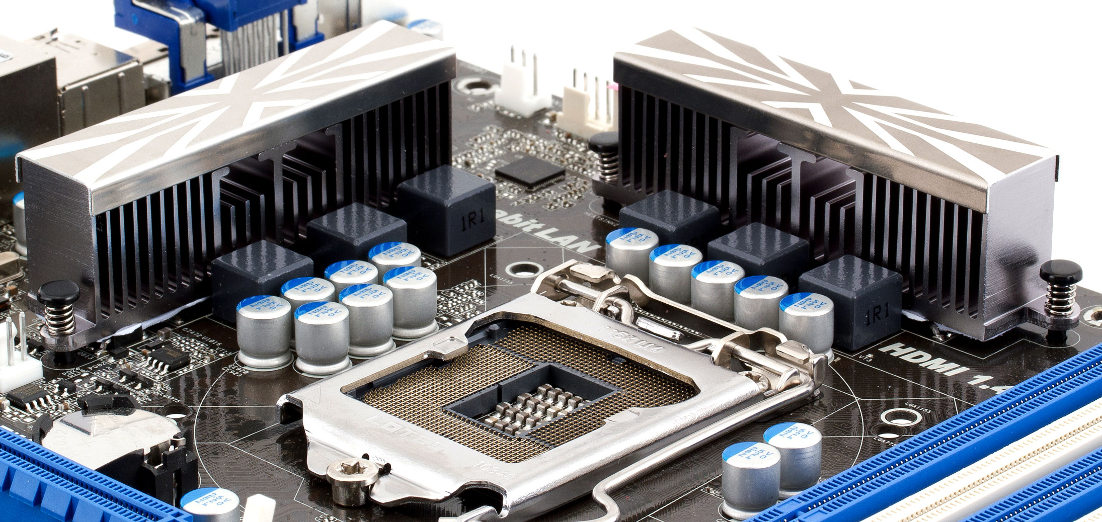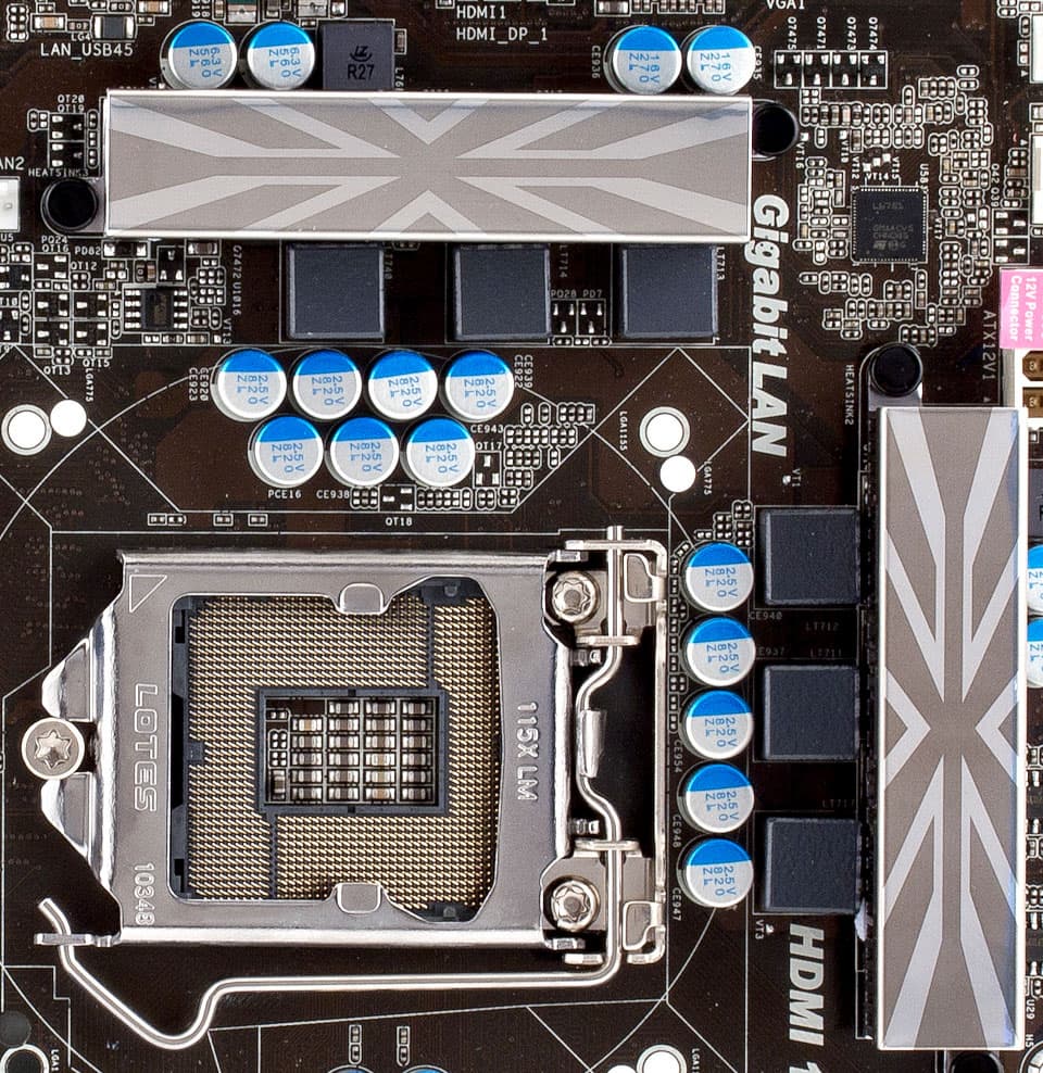 Схема преобразователя питания процессора простейшая, 4-канальная для ядра (и по одному каналу для System Agent и встроенной графики), на каждый канал по дросселю и 4 полевых транзистора, что ещё раз подтверждает ориентацию продукта на «спокойное» использование — без оверклокинга, и по возможности в комбинации с не самыми топовыми версиями процессоров. Во всех цепях на плате используются только качественные полимерные конденсаторы японского производства (Nichicon).