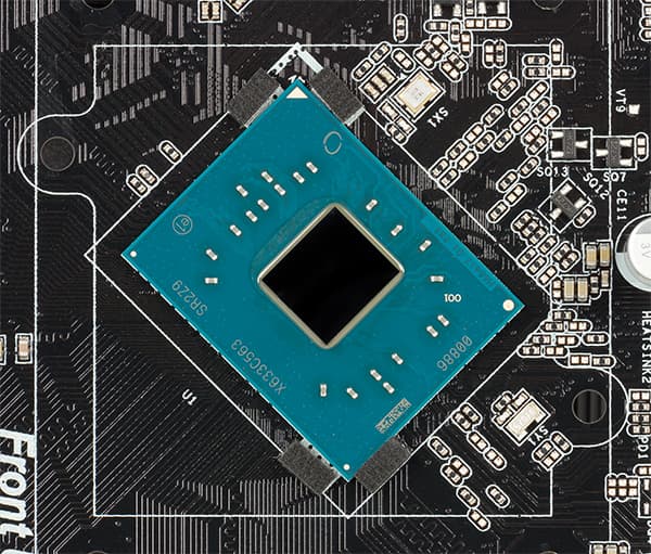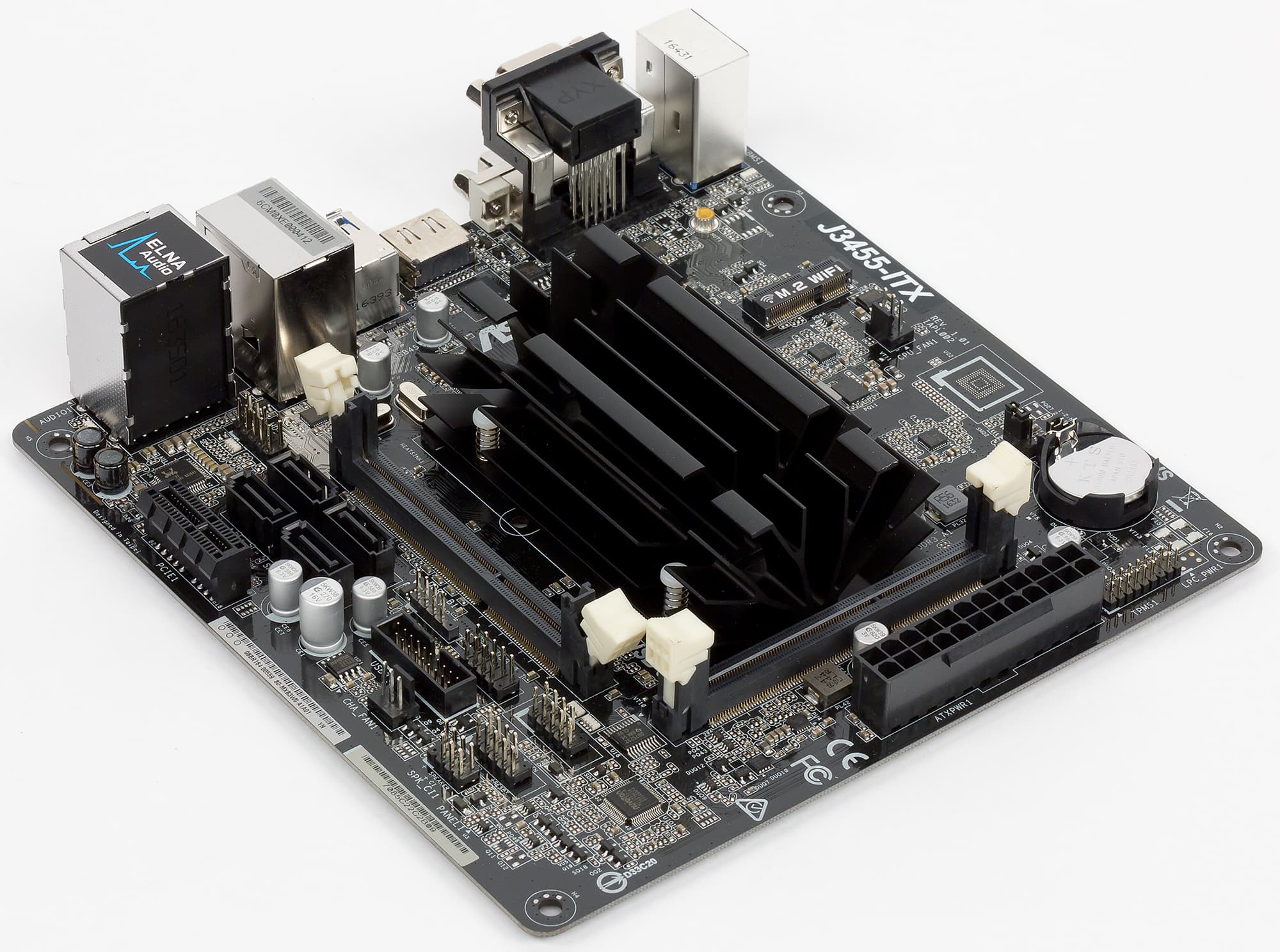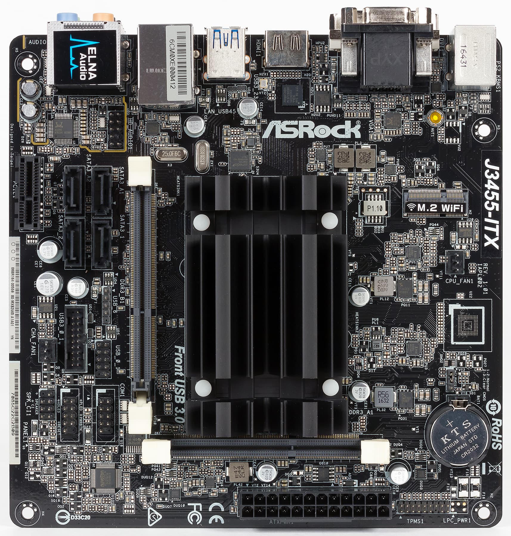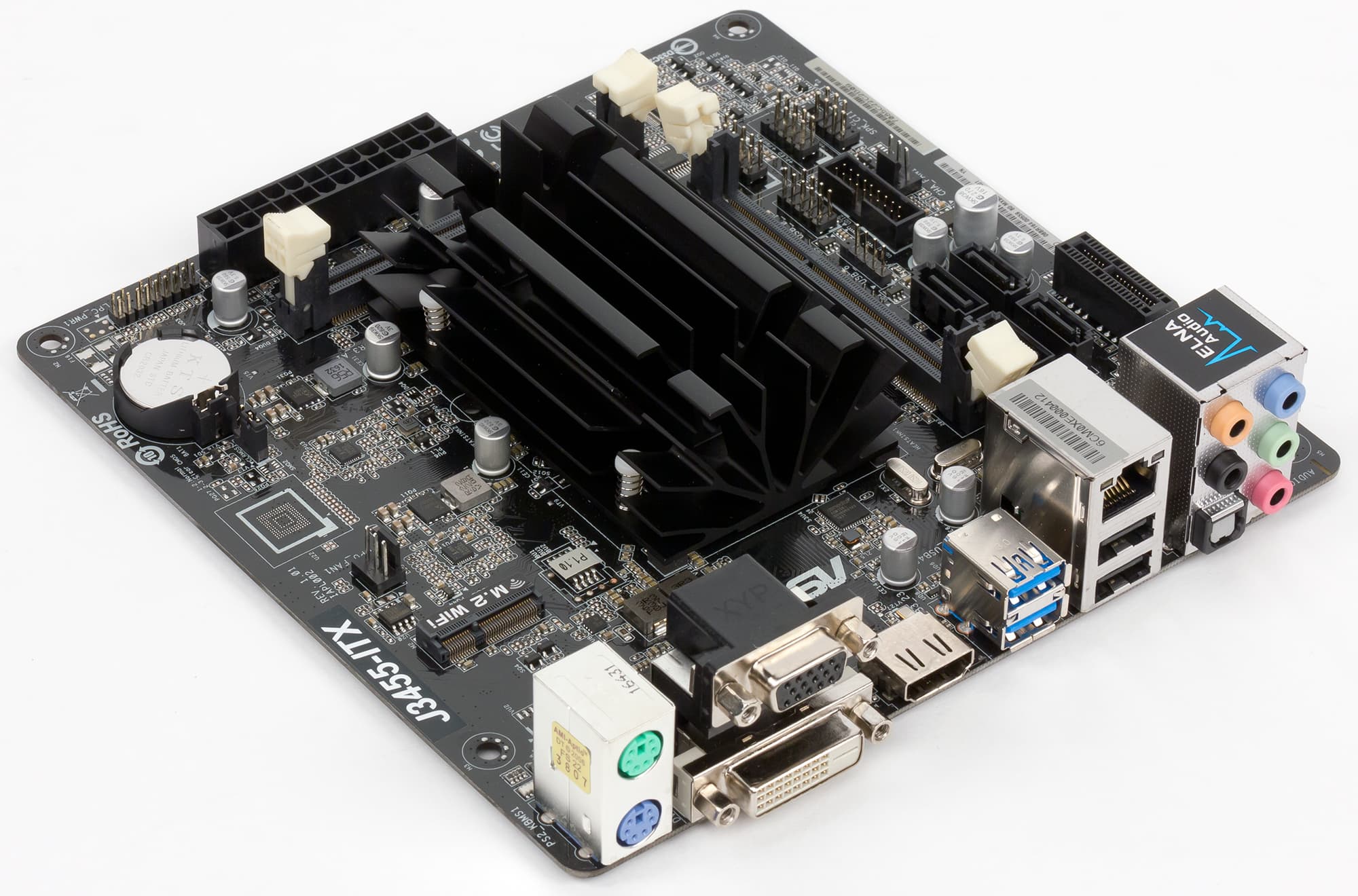 Вот уже третье поколение процессоров «атомной» линейки представляет собой SoC, т. е. не нуждается в сложной дополнительной системной логике для построения готовой системы. Поставляться же исключительно в BGA-исполнении, т. е. просто припаиваются к платам, им было свойственно и ранее, что заставляет покупателя ответственно подходить к выбору конкретной платы: последующая модернизация без ее замены невозможна. На нашей был установлен Celeron J3455 — лучший «настольный» Celeron в новой линейке, выше которого только Pentium J4205: те же четыре процессорных ядра чуть более высокой тактовой частоты, но уже 18 исполнительных блоков GPU против 12. Есть в ассортименте ASRock аналогичная плата и на нем (называется, как несложно догадаться, J4205-ITX), но использует компания и более медленный двухъядерный Celeron J3355 (в платах J3355M формата microATX и Mini-ITX J3355В-ITX). А Celeron J3455 является разумным компромиссом между ценой и производительностью, посему и удостоился чести послужить основой для целых трех плат: microATX J3455M, предназначенной в основном для модернизации старых десктопов (благодаря поддержке устаревших интерфейсов), Mini-ITX J3455В-ITX и нашей сегодняшней героини. Фактически J3455-ITX и J4205-ITX — самые дорогие в новой линейке, но благодаря наличию дополнительных контроллеров — еще и самые функциональные. Включая даже поддержку ранее не свойственных продуктам данного класса возможностей, о чем мы подробно поговорим чуть ниже.