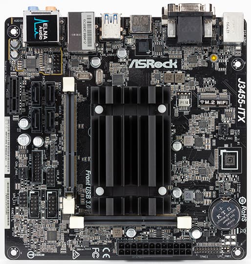 Плата ASRock J3455-ITX выполнена в форм-факторе Mini-ITX (170 × 170 мм) и может быть установлена в корпус, поддерживающий платы этого форм-фактора или большие по размеру. Для монтажа платы предусмотрено четыре стандартных отверстия.