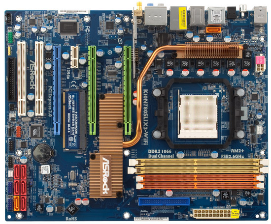 Плата основана на чипсете NVIDIA nForce 780a, о возможностях которого вы можете узнать из обзорной статьи по ссылке. Поддерживаются все процессоры, выпущенные, как для разъема Socket AM2+, так и AM3, в качестве оперативной памяти может быть установлено до 16 ГБ DDR2-667/800/1066. Для подключения накопителей установлено 6 внутренних портов SATA/300, которые могут объединяться в режимах RAID 0, 1, 0+1 и 5, шестой (оранжевого цвета) порт может подключаться к аналогичного цвета порту у задней панели для организации внешнего eSATA/300. Также, как и на всех платах на современных чипсетах под AMD-платформу, имеется чипсетный канал IDE с поддержкой 2 накопителей PATA/133. Функциональность чипсета дополняют следующие контроллеры: