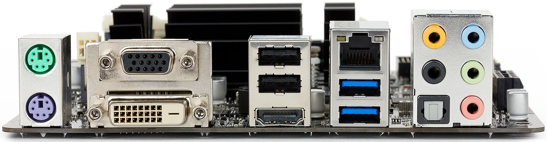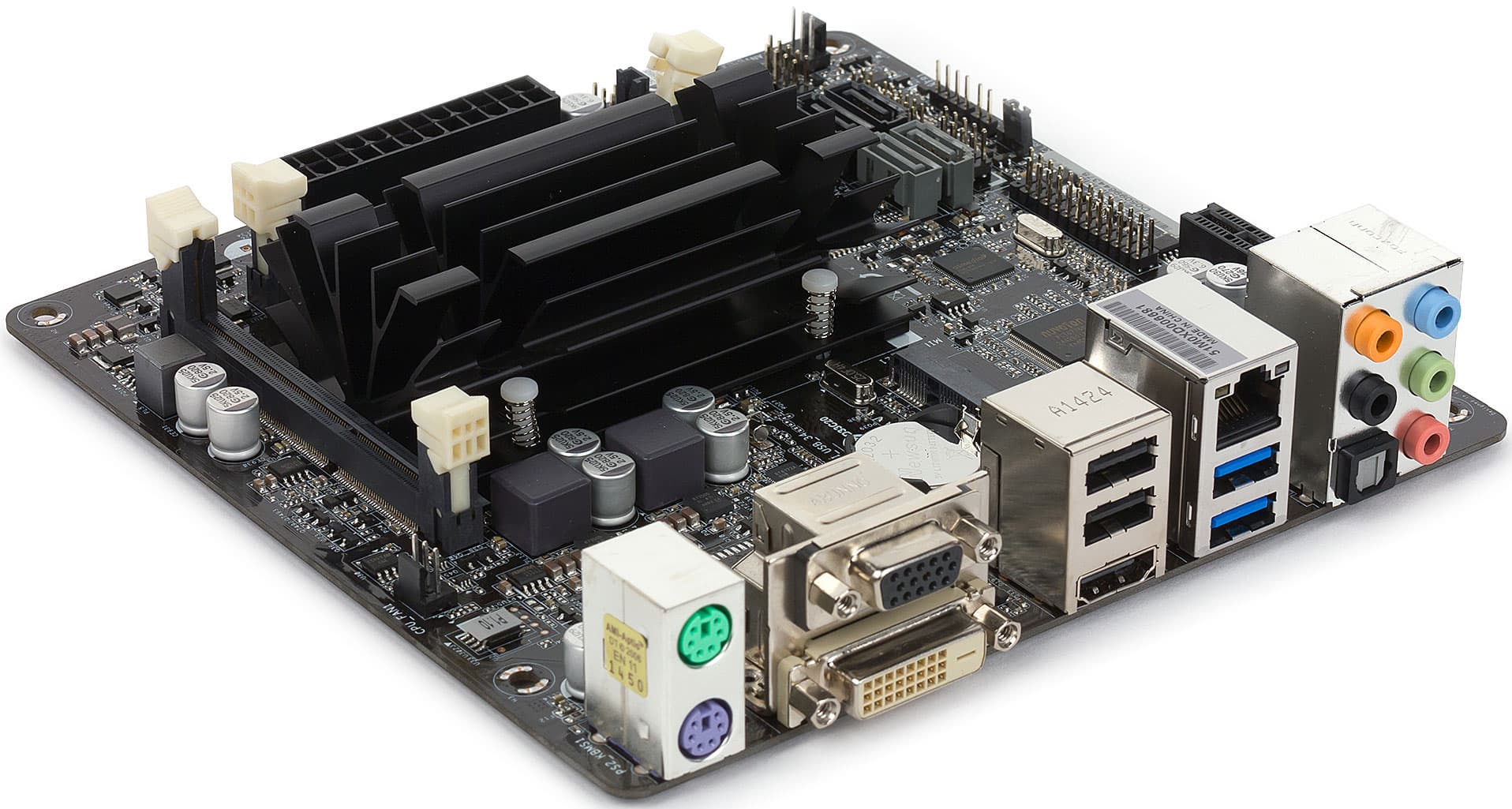 Для подключения мониторов и других устройств отображения на задней панели платы имеются порты HDMI 1.4 (максимальное разрешение 1920×1200@60 Гц), DVI-D (Single Link — 1920×1200@60 Гц) и VGA (D-Sub). Ограничение максимального разрешения — неприятная новость для тех, кто планирует собирать на этой платформе НТРС: все-таки устройства отображения информации формата 4К постепенно перестают быть экзотикой, а видеоядро в Bay Trail-D умеет декодировать такое видео аппаратно. С другой стороны, пока это существенной проблемы для подавляющего большинства пользователей не составляет.