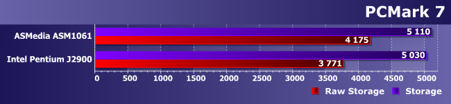 Для подключения накопителей или оптических приводов на плате предусмотрено два порта SATA 3 Гбит/с, которые реализованы на базе интегрированного в процессор контроллера и еще два дополнительных порта SATA 6 Гбит/с, появившиеся благодаря распаянному дополнительному контроллеру ASMedia ASM1061 (с интерфейсом PCIe 2.0 x1). Таким образом, плату можно использовать и в системах с более чем двумя накопителями, на что спрос есть. А какой из контроллеров более предпочтителен, если хватает и пары портов? Мы провели небольшое экспресс-тестирование силами PCMark 7, взяв в качестве «рабочего тела» SSD-накопитель Sandisk Extreme Pro 480 ГБ: