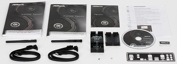 Кроме самой платы, в комплект поставки входит инструкция пользователя, DVD-диск с программным обеспечением и драйверами, четыре SATA-кабеля (все разъемы с защелками, два кабеля имеют угловой разъем с одной стороны), мостики SLI на три и две видеокарты, заглушка для задней панели платы и две антенны для Wi-Fi-модуля. Комплектация точно такая же, как у ASRock X99 Taichi, и, вообще говоря, для топового продукта довольно бедненькая. Особенно удивляет, что поскупились на SATA-кабели.