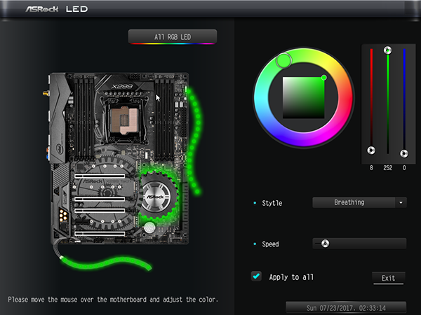 Под радиатором, который немного приподнят над платой, вдоль контура расположено несколько RGB-светодиодов. В настройках BIOS можно выбрать цвет и тип эффекта подсветки (статический, дыхание, стробирование и т. д.)