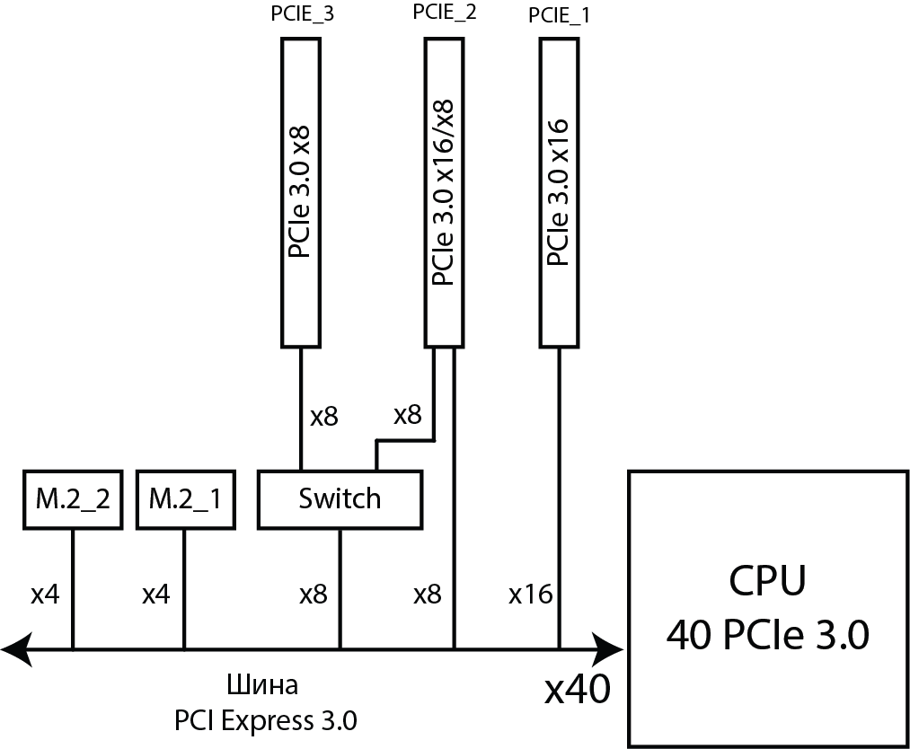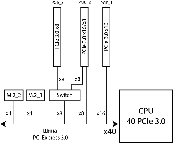 В случае процессоров с 40 линиями PCIe 3.0 третий слот разъемы M.2 никак не разделяют линии PCIe 3.0 с разъемами PCI Express 3.0 x16 (40 линий хватает на все).