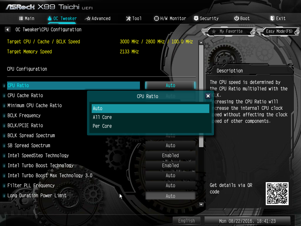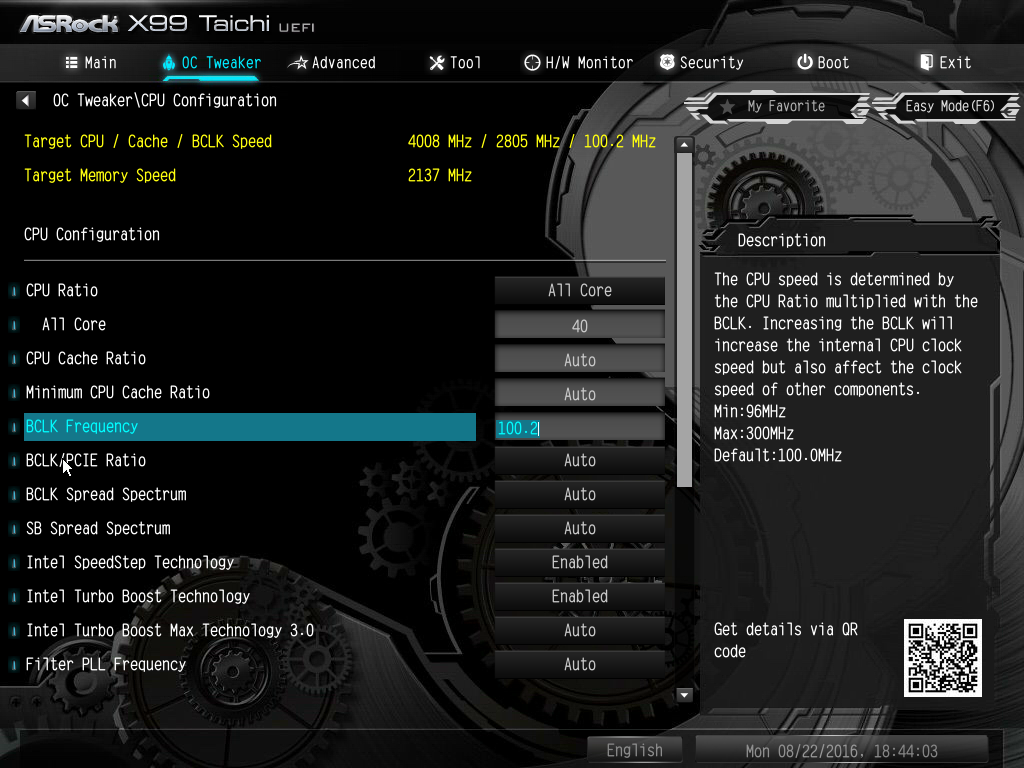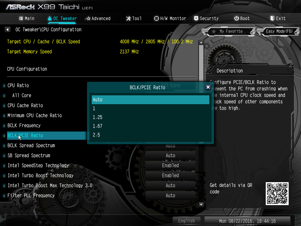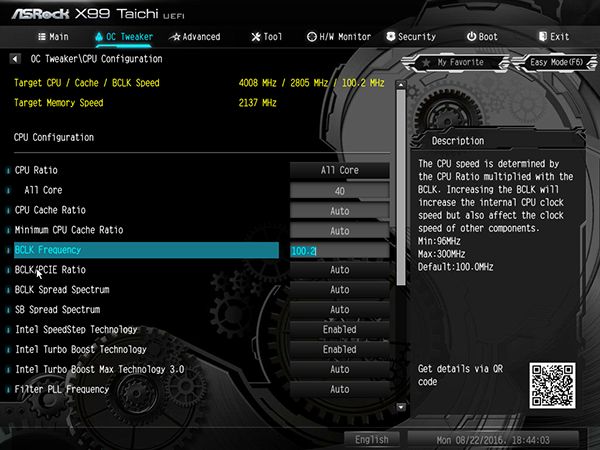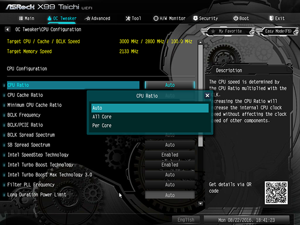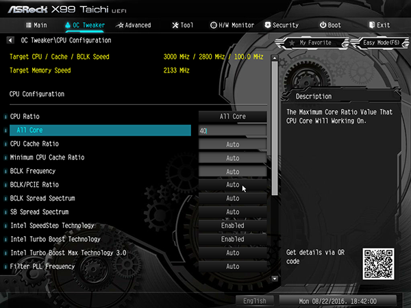 В качестве примера укажем, что процессор Intel Core i7-5960X на этой плате нам удалось разогнать только до частоты 3,9 ГГц при частоте BCLK Frequency 100 МГц и множителе BCLK/PCIE Ratio равном 1,00. Для разгона мы изменяли только коэффициент умножения, а все остальные параметры не менялись (значения auto).