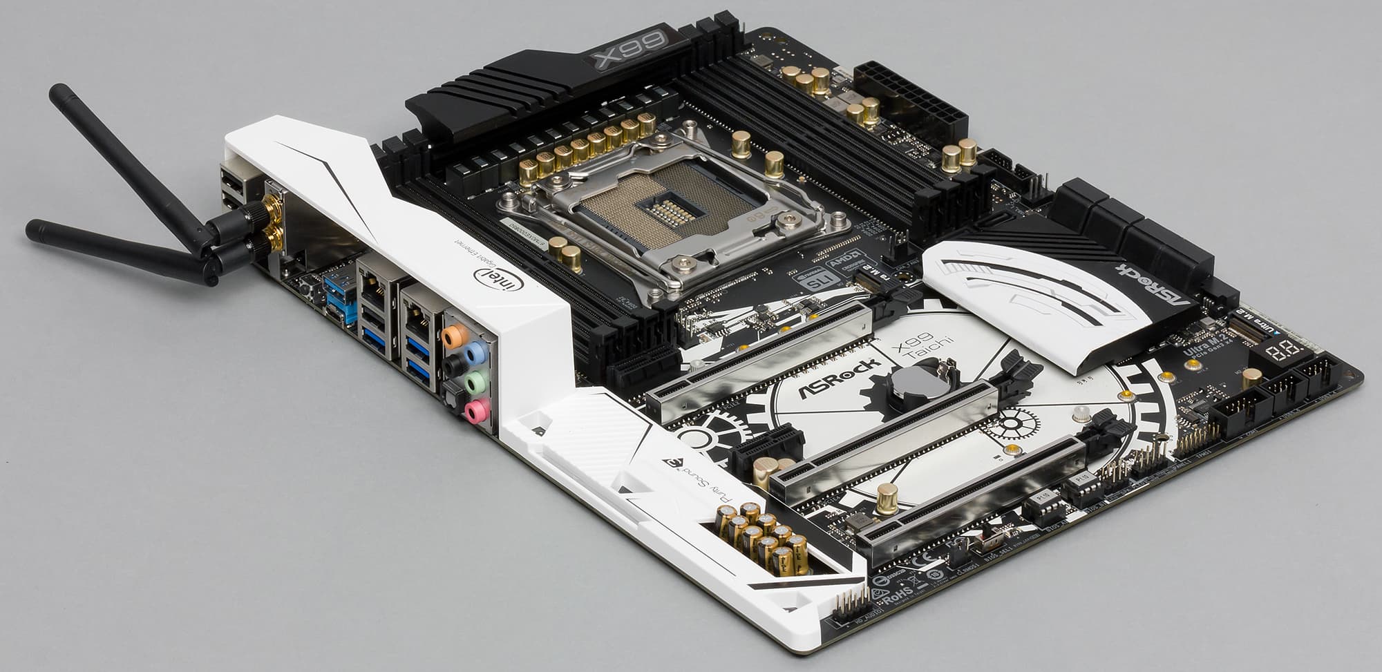 Плата ASRock X99 Taichi основана на топовом чипсете Intel Х99 и поддерживает процессоры c кодовым наименованием Haswell-E и Broadwell-E с разъемом LGA 2011-v3, а также процессоры Intel Xeon E5 v.4. Причем поддержка процессоров семейства Intel Xeon E5 — это одна из отличительных особенностей данной платы. Далеко не каждая модель на чипсете Intel X99 поддерживает процессоры Intel Xeon E5.