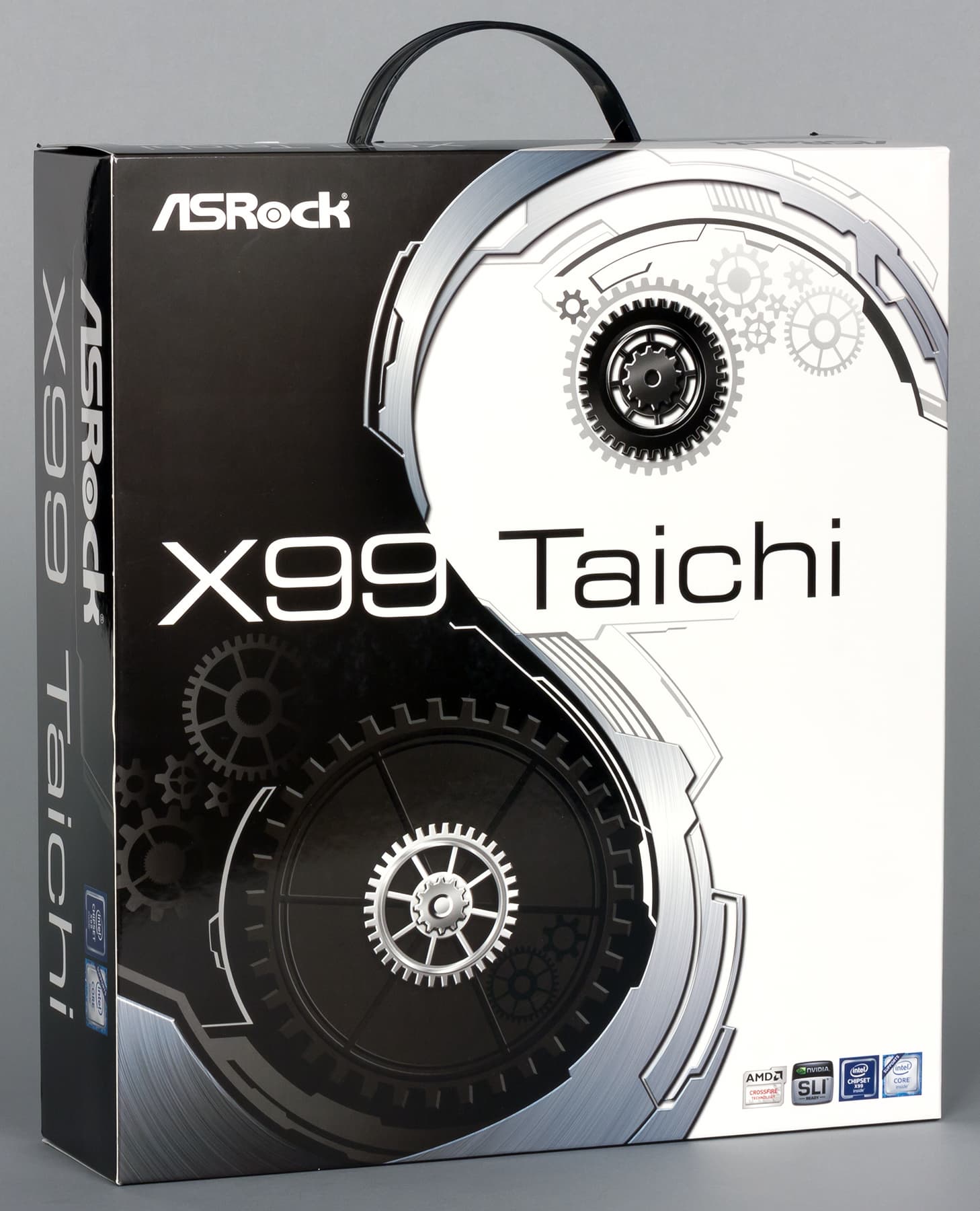 Плата ASRock X99 Taichi поставляется в большой коробке с ручкой, на которой нанесено название платы и перечислены все ее особенности.
