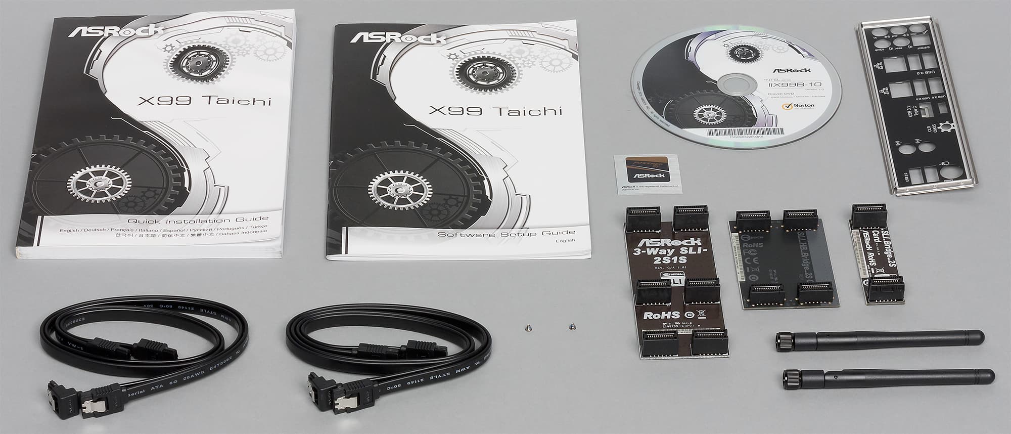 Кроме самой платы в комплект поставки входит инструкция пользователя, DVD-диск с программным обеспечением и драйверами, четыре SATA-кабеля (все разъемы с защелками, два кабеля имеют угловой разъем с одной стороны), мостики SLI на три и две видеокарты, заглушка задней панели платы и две антенны для Wi-Fi-модуля.