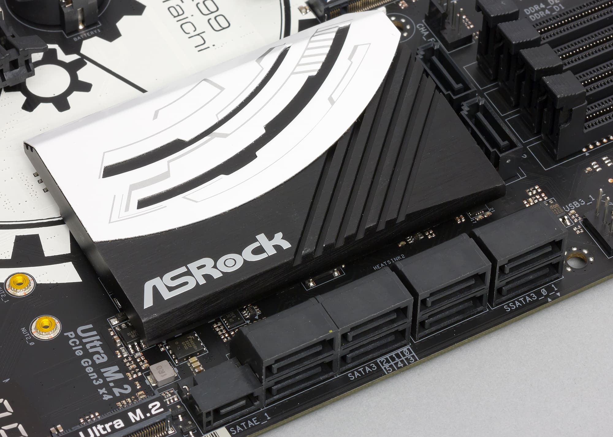 Все порты SATA 6 Гбит/с реализованы на базе интегрированного в чипсет Intel X99 контроллера. Шесть из десяти портов SATA 6 Гбит/с поддерживают возможность создания RAID-массивов уровней 0, 1, 5, 10 (ограничение чипсета). Четыре порта, которые не поддерживают возможность создания RAID-массивов, легко отличить от остальных. Они обозначаются на плате как SSATA. Отметим, что два порта SSATA выполнены вертикально.