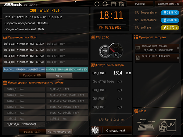 Традиционно UEFI BIOS имеет два режима отображения: упрощенный (Easy Mode) и Advanced Mode.