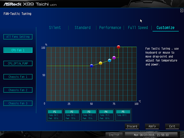 Еще одна полезная настройка в UEFI BIOS — возможность управления режимом работы подключенных к плате вентиляторов. Для двух вентиляторов кулера процессора, а также для дополнительных корпусных вентиляторов имеется возможность выбрать один из четырех предустановленных скоростных режимов работы (Full Speed, Performance, Standard, Silent) или по пяти точкам построить график зависимости скорости вращения вентилятора от температуры. Причем для корпусных вентиляторов температуру можно привязывать как к процессору, так и к системной плате.