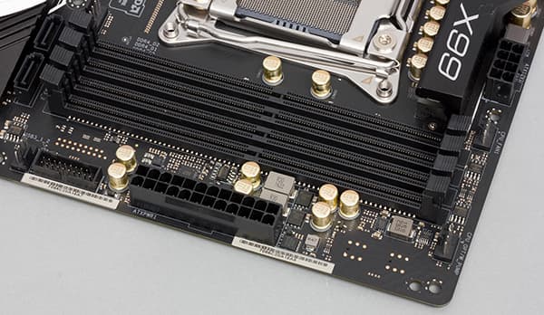Для установки модулей памяти на плате ASRock X99 Taichi предусмотрено восемь DIMM-слотов, что позволяет устанавливать по два DDR4-модуля на каждый из четырех каналов памяти с максимальным объемом до 128 ГБ (при использовании 16-гигабайтных модулей памяти). При использовании процессоров семейства Intel Core i7 поддерживается обычная память DDR4, то есть регистровая (RDIMM) и нерегистровая (UDIMM) память без ECC.