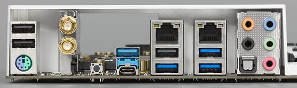 | Разъемы на задней панели | 1× USB 3.1 (Type-C) 3× USB 3.1 (Type-A) 3× USB 3.0 3 × USB 2.0 2 × RJ-45 2 разъема для подключения антенны Wi-Fi-модуля 1 × PS/2 1 × S/PDIF (оптический, выход) 5 аудиоразъемов типа миниджек |
