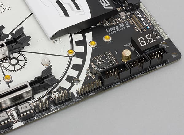 На базе процессорных линий PCIe 3.0 реализованы не только слоты PCI Express 3.0 x16, но также и два разъема M.2. Оба разъема M.2 поддерживают накопители с интерфейсом SATA 6 Гбит/с и PCIe 3.0 x4.