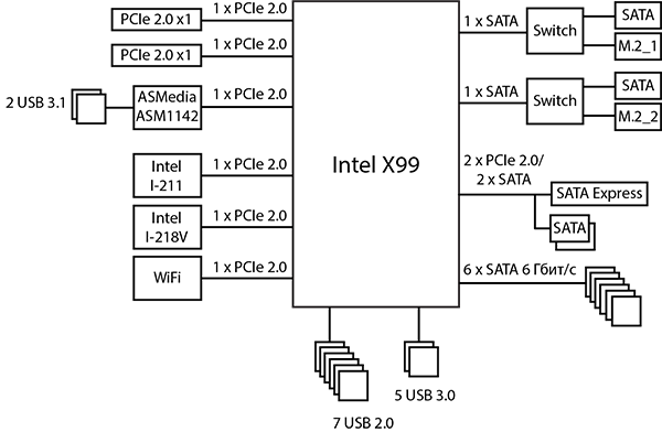 Напомним, что в чипсете Intel X99 общее количество портов PCIe 2.0 не может превышать восьми, причем суммарно может быть не более 22 высокоскоростных порта ввода/вывода (PCIe 2.0, SATA 6 Гбит/с, USB 3.0). Из 22 высокоскоростных портов ввода/вывода 18 портов строго фиксировано: это четыре порта USB 3.0, шесть портов PCIe 2.0 и восемь портов SATA 6 Гбит/с. А вот еще четыре порта можно переконфигурировать: два из них могут работать либо как USB 3.0, либо как PCIe 2.0, а еще два других – как PCIe 2.0 или SATA 6 Гбит/с.