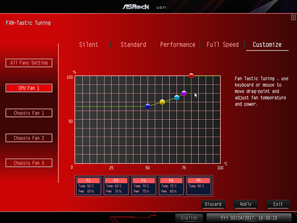 Есть возможность настройки скоростного режима всех вентиляторов, подключенных к плате. Причем можно выбрать один из четырех пресетов или произвести настройку вручную по пяти точкам на графике.
