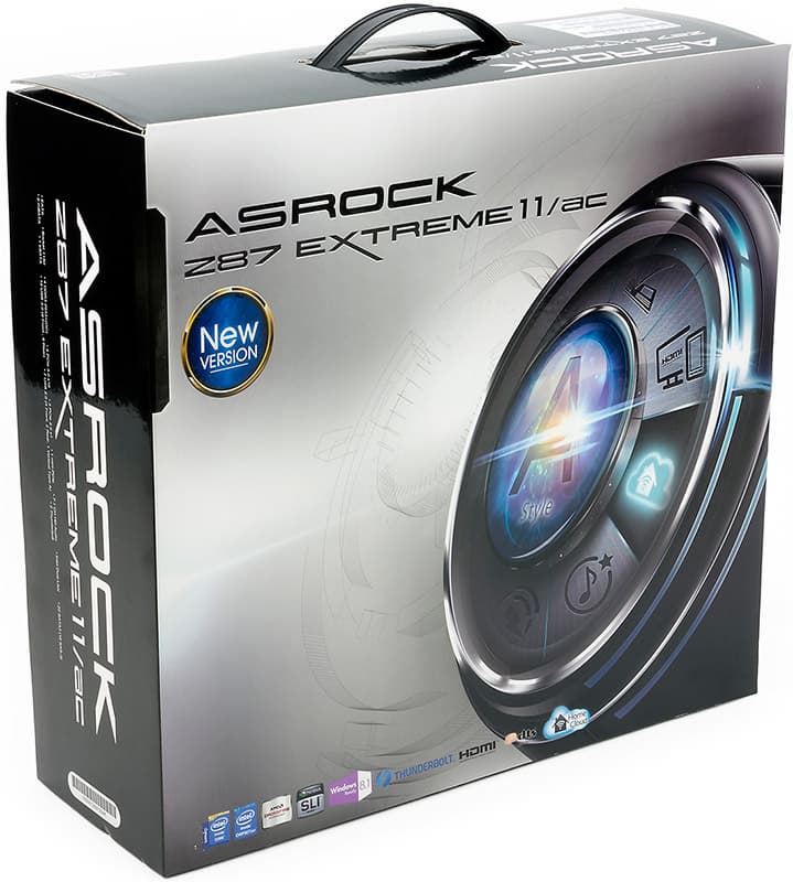 Плата ASRock Z87 Extreme11/ac, как и положено топовому решению, поставляется в довольно большой коробке с ручкой.