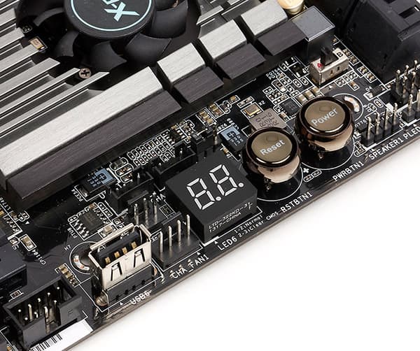 Среди особенностей платы ASRock Z87 Extreme11/ac стоит отметить наличие кнопок включения питания и перезагрузки. Кроме того, имеется индикатор POST-кодов, а также кнопка Clear CMOS, вынесенная на заднюю панель платы.