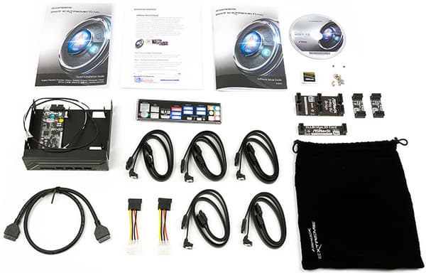 Кроме самой платы в комплектацию входит DVD-диск с драйверам и утилитами, инструкция пользователя (имеется описание и на русском языке), инструкция по настройке UEFI BIOS (только на английском языке), десять SATA-кабелей (все разъемы с защелками, пять кабелей имеют угловой разъем с одной стороны), заглушка задней панели платы и два переходника с периферийного разъема питания на SATA. Кроме того, в комплект входят два мостика SLI на две видеокарты, один удлиненный мостик SLI на две видеокарты, установленные через слот друг от друга, и один мостик SLI на три видеокарты.