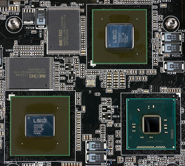 Как уже отмечалось, контроллер LSI SAS 3008 подключается по восьми линиям PCI Express 3.0 к коммутатору PLX PEX8747. Этот контроллер имеет свой процессор PowerPC 476, который работает на частоте 1,2 ГГц, а также 6 МБ памяти. Контроллер LSI SAS 3008 поддерживает порты SAS 3 (12 Гбит/с) и SATA 6 Гбит/с.
