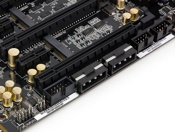 Для подключения блока питания на плате ASRock Z87 Extreme11/ac имеется 24-контактный и два 8-контактных разъема. Кроме того, для дополнительного питания видеокарт (в том случае, если их устанавливается больше одной) на плате предусмотрено еще два периферийных разъема («Molex»).