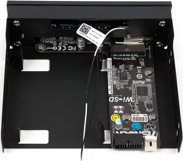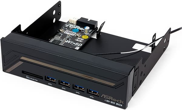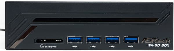 Также в комплекте имеется один кабель USB 3.0 и 5,25-дюймовая панель ASRock Wi-SD для установки в передний отсек корпуса. Данная панель имеет 4 разъема USB 3.0 и один слот для карт памяти типа SD/MMC/MS.