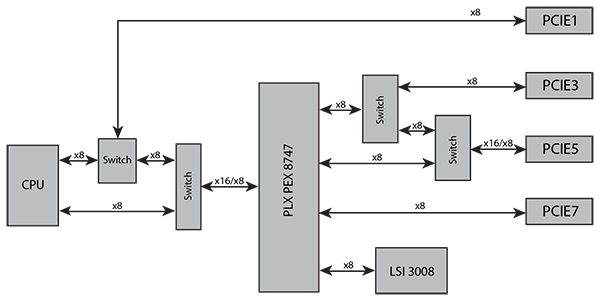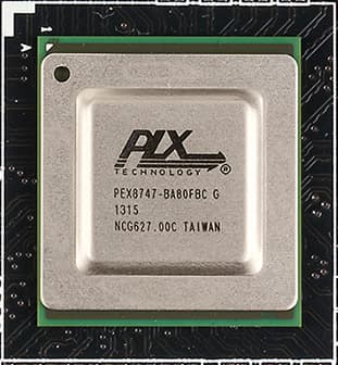 Для того чтобы увеличить количество линий PCI Express 3.0, применяется 5-портовый коммутатор PLX PEX 8747 на 48 линий PCI Express 3.0. Коммутатор PLX PEX 8747 может группировать порты шириной x8 или x16, причем один порт — входящий, и до четырех — исходящих. К примеру, можно использовать входной порт x16, получая на выходе четыре порта x8 (всего 48 линий PCI Express 3.0).