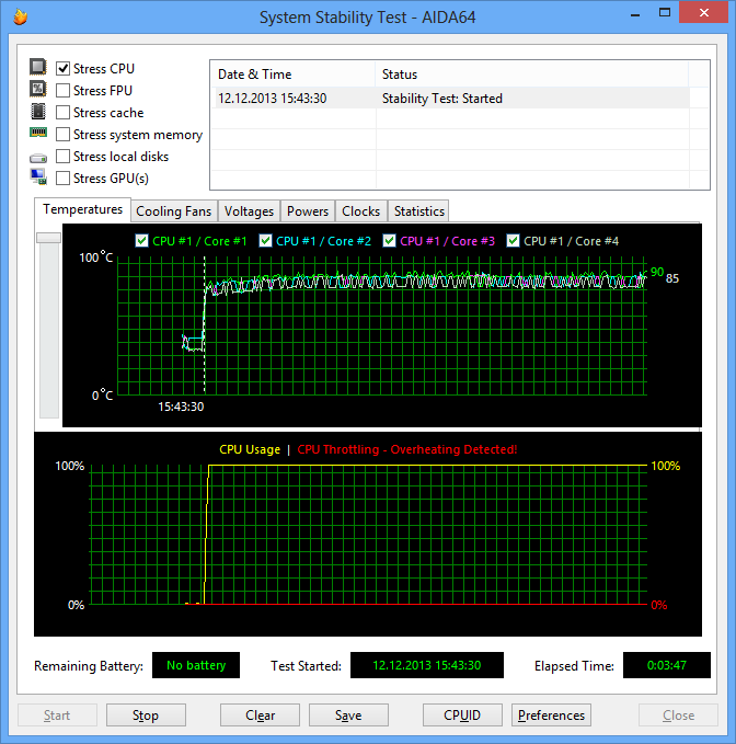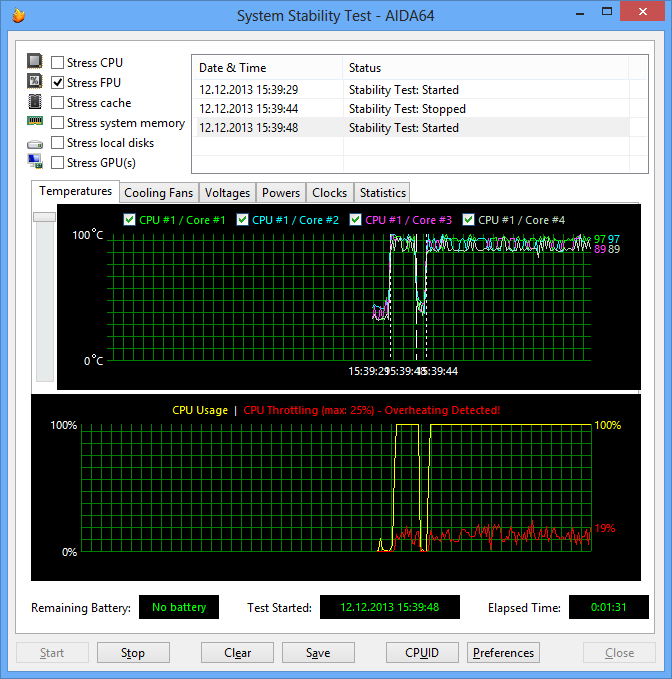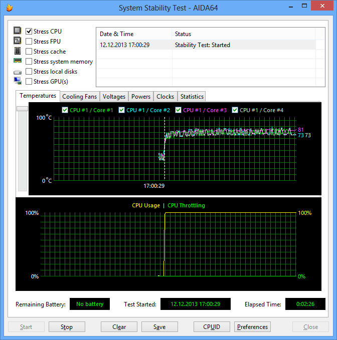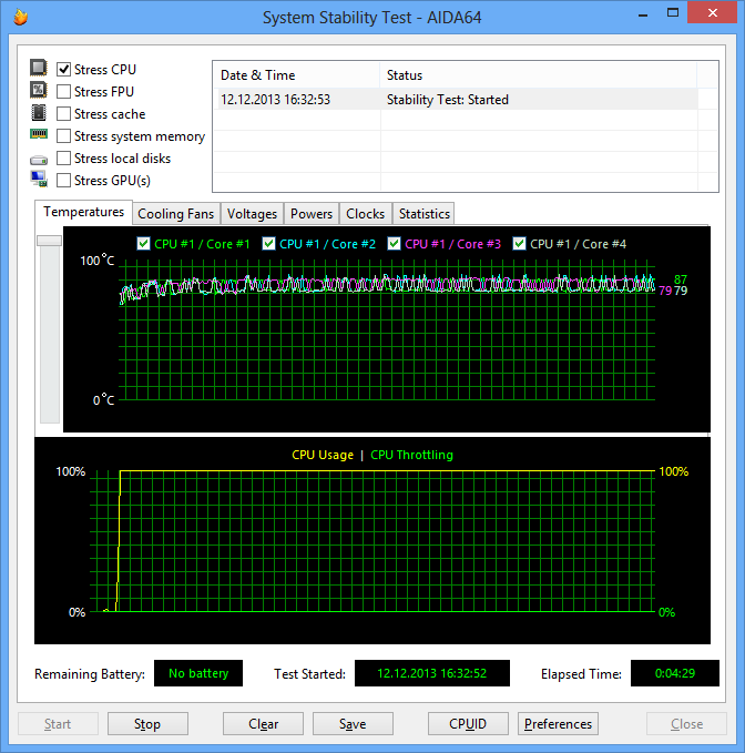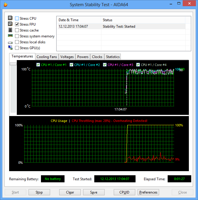 При загрузке процессора стресс-тестом Stress FPU вновь наступал перегрев процессора и включение режима троттлинга. Коэффициент умножения процессора при этом изменялся в диапазоне 17—20.