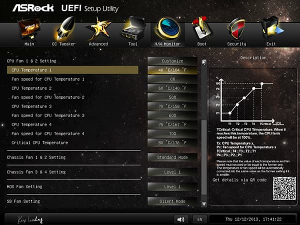 Еще одна полезная настройка в UEFI BIOS — это возможность управления режимом работы подключенных к плате вентиляторов. Для двух вентиляторов кулера процессора, а также для одного вентилятора, который установлен в радиатор на чипсете, имеется возможность выбрать один из предустановленных скоростных режимов работы или по пяти точкам построить график зависимости скорости вращения вентилятора от температуры процессора. Скорость вращения вентилятора задается в процентах (от 0 до 100%), а температура процессора выбирается из диапазона от 30 до 80 °С.