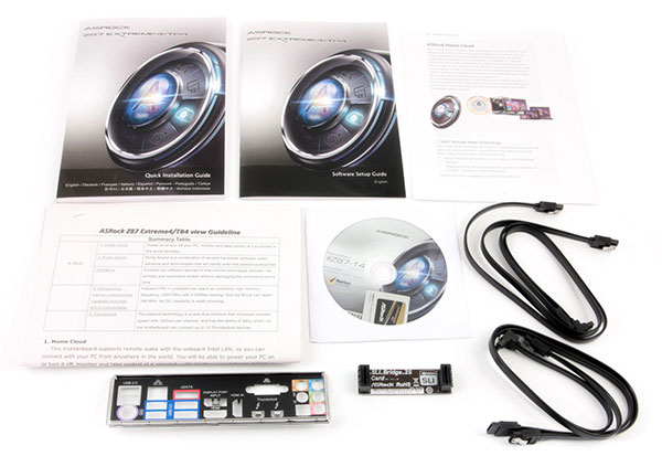 Плата ASRock Z87 Extreme4/TB4 поставляется в довольно простенькой, небольшой коробке без ручки. Кроме самой платы в комплектацию входит DVD-диск в драйверам и утилитами, инструкция пользователя (имеется описание и на русском языке), инструкция по настройке UEFI BIOS (только на английском языке), четыре SATA-кабеля (все разъемы с защелками, два кабеля имеют угловой разъем с одной стороны), заглушка задней панели платы и один мостик SLI на две видеокарты. То есть комплект поставки очень скромный и никак не соотносится с топовым сегментом материнских плат.