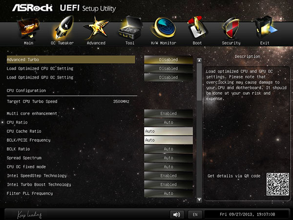Разгон процессора возможен не только за счет увеличения коэффициента умножения, но и за счет изменения опорной частоты для ядер процессора. На вкладке OC Tweaker можно задавать частоту BCLK/PCIE Frequency и частотный множитель BCLK Ratio.