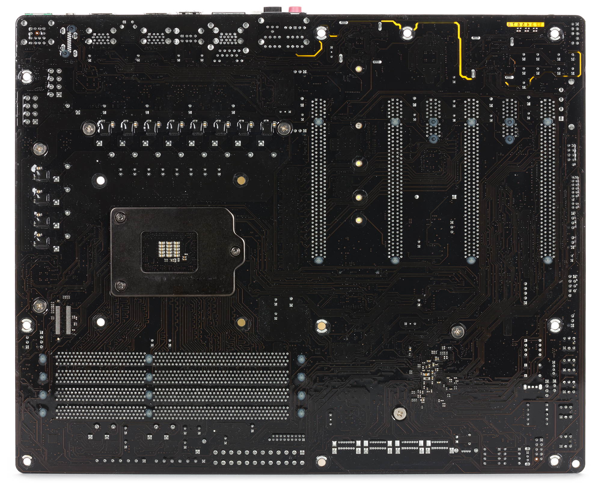 Ну и последняя особенность платы — это защитное покрытие Conformal Coating. Вся плата (со всеми микросхемами) спереди и сзади покрыта специальным полупрозрачным составом, защищающим плату от попадания жидкости. С одной стороны, это очень неплохо, особенно с учетом того обстоятельства, что данная плата ориентирована на работу без установки в корпус ПК. Но, с другой стороны, разглядеть маркировку микросхем при наличии такого защитного покрытия — это очень нетривиальная задача.