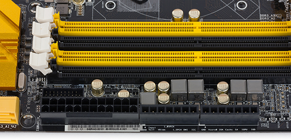Для установки модулей памяти на плате предусмотрено четыре DIMM-слота, что позволяет устанавливать по два DDR3-модуля на каждый из двух каналов памяти с максимальным объемом до 32 ГБ (при использовании 8-гигабайтных модулей). Слоты памяти, относящиеся к разным каналам, помечены разным цветом, что удобно при установке модулей. Отметим также, что плата поддерживает память с XMP-профилями.