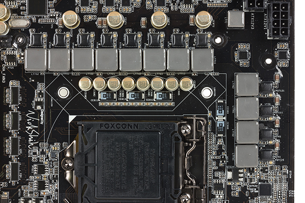Регулятор напряжения питания процессора является 12-канальным и основан на 6-фазном PWM-контроллере Intersil ISL6379. Ну а двенадцать каналов питания из шести фаз получается с помощью удвоителей фаз питания ISL6611ACRZ. Сами каналы питания построены с применением NexFet MOSFET-транзисторов, однако, разглядеть маркировку на этих транзисторах из-за покрытия Conformal Coating не представляется возможным.
