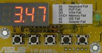 Все режимы отображаются пятью светодиодами, имеющими обозначения Status, Frequency, Fan, Temperature и Voltage. Соответственно, каждый из параметров в отображаемом режиме (например, в разделе напряжений — ядро, +3В и +5В) показывается расположенными ниже светодиодами 1, 2 и 3. Также есть светодиод Msg LED, который находится всегда в зажженном состоянии, при приходе же сообщения по факс-модему начнет мигать (для того чтобы он начал мигать, необходима операционная система с поддержкой ACPI и поддержка со стороны драйверов). Справа от этих светодиодов расположены разъемы USB (в версии iPanel Deluxe под светодиодами есть разъемы COM-порта и аудио), слева же от светодиодов расположено закрытое прозрачной пластмассой окошко, в котором находятся семисегментные светодиодные индикаторы и таблица с некоторыми кодами POST.