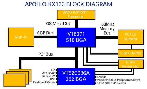 Чипсет VIA Apollo KX133 имеет классическую архитектуру и состоит из двух микросхем — северного моста VT8371 и южного моста VT82C686A, которые соединяются шиной PCI: