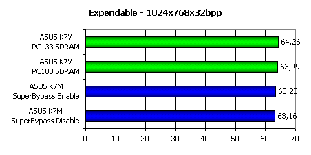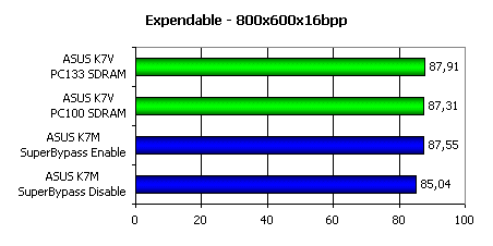 И снова похожая картина — обе платы, на VIA Apollo KX133 и на AMD 750, работают с примерно одинаковой скоростью. И это несмотря на то, что производительность в Expendable сильно зависит от быстродействия подсистемы памяти.