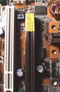 Кратко остановимся на слоте AGP, имеющемся на K7V. Вслед за ASUS P3C2000, K7V стала второй системной платой, оборудованной слотом AGP Pro. Хотя этот слот имеет несколько большее число контактов, нежели обычный AGP, он без проблем совместим с обычными AGP 1x/2x и 4x видеокартами. Кратко, суть его отличий от привычного AGP 2.0 заключается в том, что к обычному разъему AGP по краям добавлены выводы для подключения дополнительных цепей питания 12В и 3.3В. Эти цепи призваны обеспечить увеличенное энергопотребление видеокарты, позволяя ей потреблять до 110 Вт. С практической точки зрения, наличие на K7V слота AGP Pro дает возможность использовать с этой платой, например, некоторые видеокарты на базе NVIDIA GeForce256 с 64 Мбайтами памяти. Во избежание неправильной установки обычных AGP видеокарт в более длинный слот AGP Pro, первые 20 контактов слота, не используемые обычными видеокартами, заблокированы специальной заглушкой.
