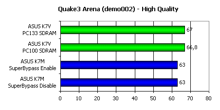 Режим High Quality в Quake III — идеальные условия для обнаружения преимуществ AGP 4x, так как именно в этом режиме шина AGP оказывается наиболее загружена работой. Вот и в данном случае, K7V, работающая в режиме AGP 4x, легко обошла K7M, функционирующую в режиме AGP 1x, более чем на 6% (платы на AMD 750 в режиме AGP 2x работают нестабильно с видеокартами на NVIDIA GeForce256, поэтому существующие драйвера используют AGP 1x).