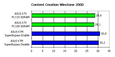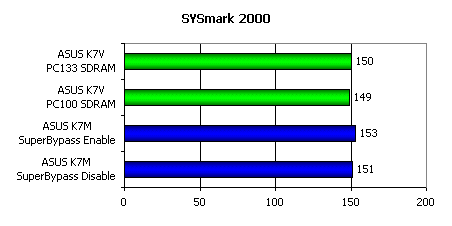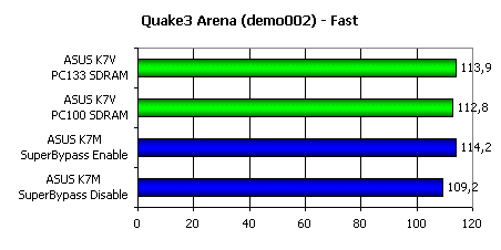 ASUS K7V тестировалась в двух режимах: с памятью, работающей на частоте 133 МГц, и с памятью, работающей на частоте 100 МГц. Тесты на ASUS K7M также запускались в двух режимах — с включенной и выключенной опцией SuperBypass. Включение SyperBypass в системах на чипсете AMD 750 позволяет уменьшить латентность подсистемы памяти примерно на 25%, однако, к сожалению, в первых ревизиях чипсета эта функция была реализована неправильно и не работала.