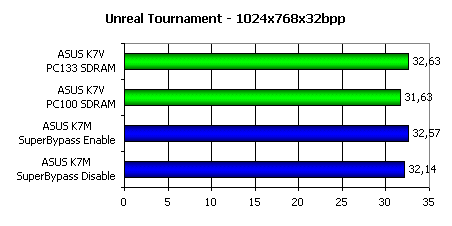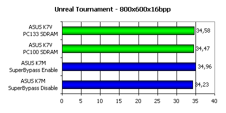 Unreal Tournament — очень ресурсоемкая игра. В силу особенностей этого игрового движка, количество fps в ней мало зависит и от скорости процессора и от скорости видеокарты. Поэтому, мы наблюдаем здесь практически одинаковые цифры у обеих протестированных плат. Тем не менее, AMD 750 со включенным SuperBypass все-таки оказывается чуть впереди.