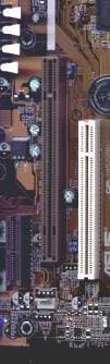 Беглый же взгляд на ASUS P3C2000 обнаруживает ряд интересных моментов. Первая, сразу бросающаяся в глаза особенность заключается в том, что слот AGP на данной материнской плате несколько отличатся от того, что мы привыкли видеть обычно. Пугаться не следует, просто P3C2000 стала одной из первых плат, оборудованных разъемом AGP Pro. Этот слот совместим с обычными AGP 1x, 2x и 4x видеокартами. Кратко, суть его отличий от привычного AGP 2.0 заключается в том, что к обычному разъему AGP по краям добавлены выводы для подключения дополнительных цепей питания 12В и 3.3В. Эти цепи призваны обеспечить увеличенное энергопотребление видеокарты, позволив ей потреблять до 110 Вт. То есть наличие на P3C2000 слота AGP Pro может заинтересовать только профессионалов, интересующихся высокопроизводительными и энергоемкими видеоплатами, которых, кстати, пока под AGP Pro не выпускается. Правда, вполне возможно, ситуация в ближайшем будущем будет меняться и наличие такого слота на материнских платах будет востребовано, например, тот же ASUS собирался выпустить AGP Pro видеокарту на NVIDIA GeForce 256.