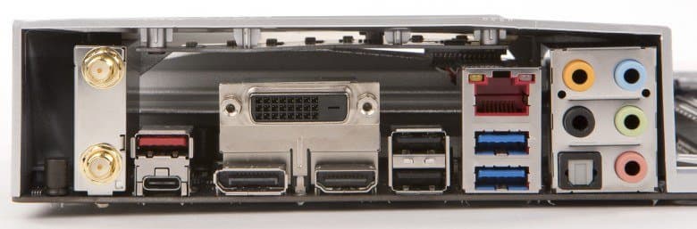 | Разъемы на задней панели | 2 × USB 3.0 (Type-A) 1 × USB 3.1 (Type-C) 1 × USB 3.1 (Type-A) 2 × USB 2.0 1 × DisplayPort 1 × HDMI 1 × DVI 1 × RJ-45 1 × S/PDIF (оптический, выход) 5 аудиоразъемов типа миниджек (3,5 мм) 2 разъема для антенны Wi-Fi-модуля |