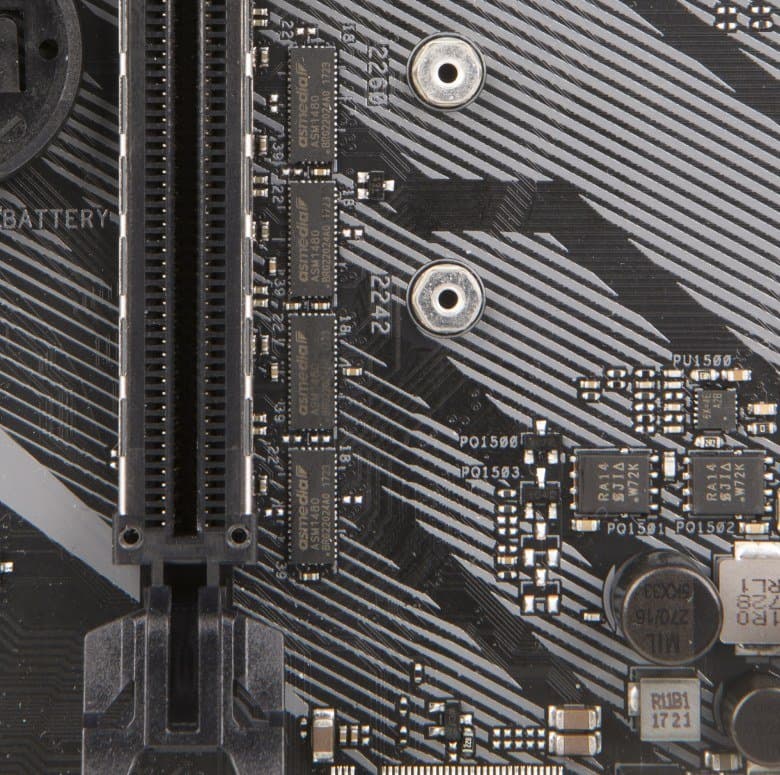 Кроме того, один контроллер ASMedia ASM3142, на базе которого реализован вертикальный разъем для подключения фронтального порта USB 3.1, разделяется с двумя слотами PCI Express 3.0 x1 (PCIE_x1_2 и PCIE_x1_4). Режим работы (слоты PCIE_x1_2 и PCIE_x1_4 или контроллер ASMedia ASM3142) задается в настройках BIOS.