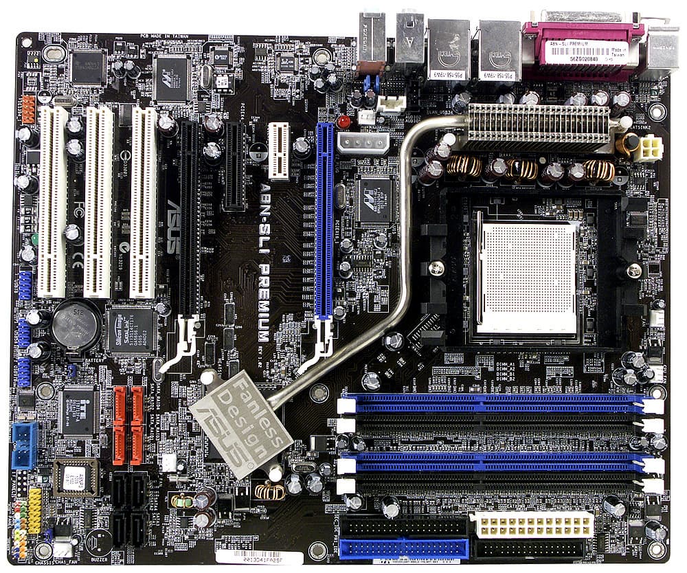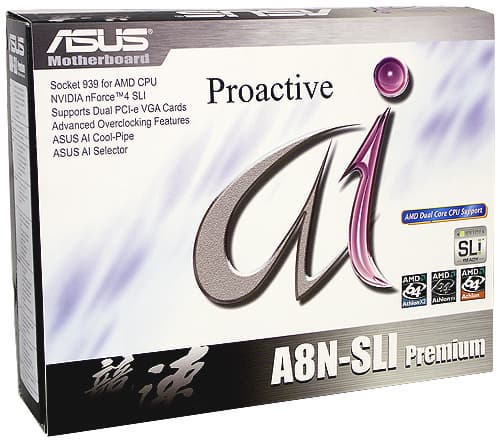 В трехканальном импульсном стабилизаторе напряжения питания процессора применены 9 конденсаторов по 1500 мкФ и 2 по 820 мкФ, также на плате находится стабилизатор напряжения памяти (10 конденсаторов по 820 мкФ (усилен индуктивными элементами)). В критических цепях применены в основном электролитические конденсаторы от компаний Rubycon. На плате нет разведённых, но не распаянных элементов. Отметим, что A8N-SLI Premium — это старшая модель из линейки системных плат компании ASUS, оснащённых чипсетом nForce4 SLI. Две другие — ASUS A8N-SLI Deluxe и ASUS A8N-SLI, отличаются от рассматриваемой нами сегодня платы, первая — тем, что управление режимом SLI у нее происходит "планочным" методом (т.е. с помощью планки-переключателя) и отсутствием AI Cool-Pipe, а вторая, кроме этого, лишена SATA RAID-контроллера Sil3114. Размер платы — 305х245 мм (полноразмерный ATX, крепление к корпусу десятью винтами, все края платы жестко фиксированы).