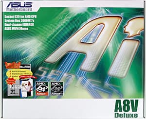 Плата категории Top-end, укомплектованная и «нафаршированная» сообразно цене. Изюминкой здесь является входящий в комплект адаптер WiFi-g, это первый известный нам случай, когда в комплект поставки системной платы входит устройство с поддержкой этого стандарта. Кроме этого, A8V Deluxe — первая плата для новой платформы AMD Socket 939, попавшая в нашу тестовую лабораторию.