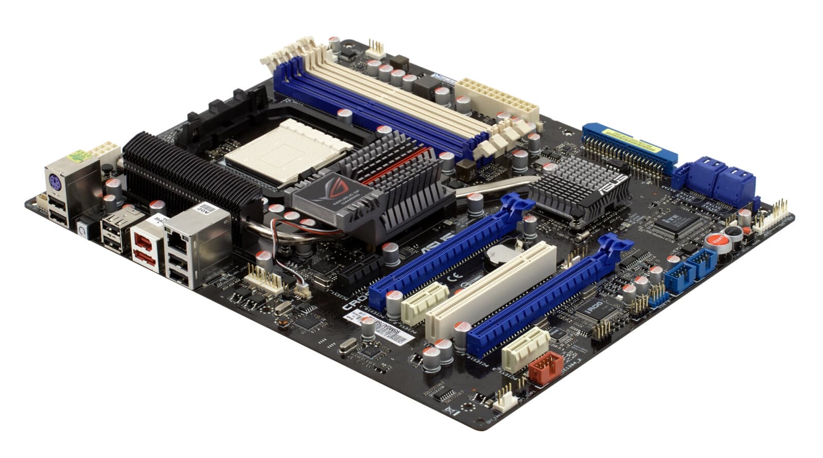 Хотя чипсет AMD 790FX поддерживает установку до 4 слотов PCI Express X16 и, соответственно, объединение такого количества видеокарт в режиме CrossFIreX, в ASUS решили ограничиться двумя слотами. И, пожалуй, это правильная тактика, поскольку со времени выпуска этого чипсета рынок видеокарт претерпел заметные изменения. Планируя сейчас получить максимальную производительность мультичиповой конфигурации, логично поставить именно две карты, но на основе двух чипов каждая. Это же положение дел сохранится и с выпуском серии видеокарт Radeon HD5000, лишь будет промасштабированно для покорения новых вершин в абсолютных значениях fps. Гораздо важнее, что при установке двухслотовых карт в первый и второй слот останется место для воздухозабора, поскольку карты располагаются через двойное расстояние, также и в хвостовой части ничего из периферийных интерфейсов не помешает.